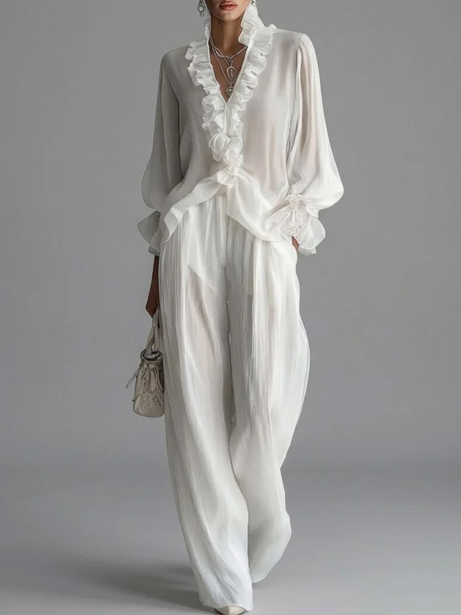 Women's Ruffled V-neck Long-sleeved Casual Loose Chiffon Top With Elastic Waist And Wide-leg Pants Set