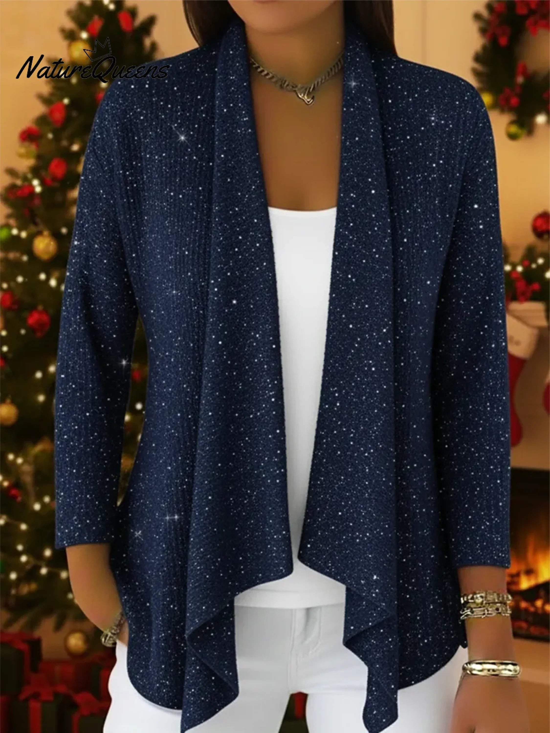 Made from soft, silver-threaded sequined cotton yarn, this cardigan sweater shimmers and shines while ensuring comfort.