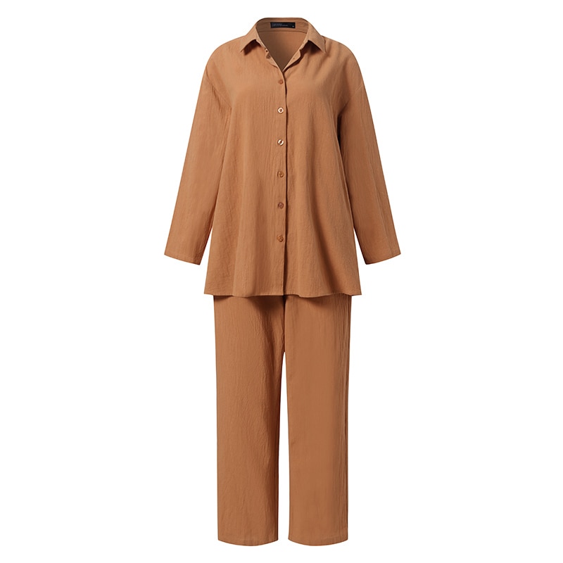 Package included:1 Suit Material:100% Cotton Colors:Yellow,Beige,Navy Sleeve Length:Full Sleeve Neckline:Turn-Down-Collar Pattern:Solid Color Length:Ankle Length Buckle chain:Button Down Front Thickness:Thin Features:Pure cotton Style:Leisure,Bohemian,Retro,Europe Season:Spring,Summer,Autumn Occasion:Family,Party,Beach,Wedding,Holiday Attentions: 1.The Real Object May Exist Slightly Colors Differences Compared To Images As Different Computers Display.Caution If Minding,Thanks. 2.There Might Be A Manual Measuring 1-3 cm Error.Sorry For Any Inconvenience. 3.Please Prevail On Real Item, Model Images For Reference Only. 4.Attention!!!Please check the size chart carefully before placing the order.| Size | US | UK | EUR | Shoulder width | Bust | Sleeve length | Clothing length | Waist circumference | Hip circumference | Pants length | | CM | CM | CM | CM | CM | CM | CM | | S | 4-6 | 10 | 36 | 48 | 99 | 52 | 71 | 62-77 | 101 | 96 | | M | 8-10 | 12 | 38 | 49 | 104 | 53 | 72 | 66-81 | 106 | 97 | | L | 12-14 | 14 | 40 | 50 | 109 | 54 | 73 | 70-85 | 111 | 98 | | XL | 16-18 | 16 | 42 | 51 | 114 | 54 | 74 | 74-89 | 116 | 99 | | XXL | 20-22 | 18 | 44 | 52 | 119 | 55 | 75 | 78-93 | 121 | 100 | | 3XL | 24-26 | 20 | 46 | 53 | 124 | 55 | 76 | 82-97 | 126 | 101 | | 4XL | 28-30 | 22 | 48 | 54 | 129 | 56 | 77 | 86-101 | 131 | 102 | | 5XL | 32-34 | 24 | 50 | 55 | 134 | 57 | 78 | 90-105 | 136 | 103 | | Plain measurement difference of 1-3cm normal |