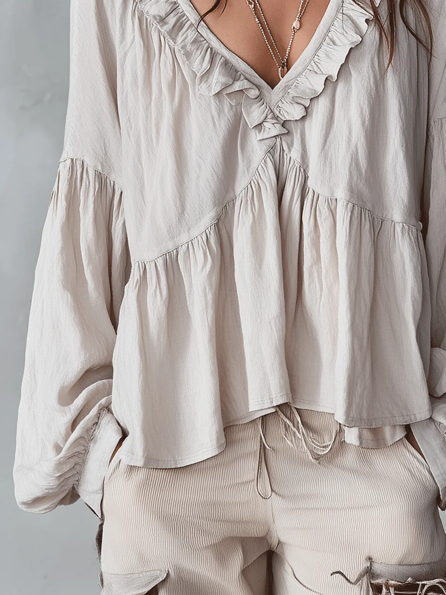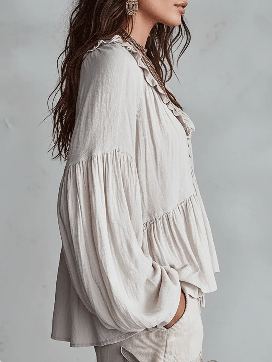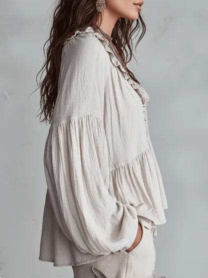 Women's Solid Color Retro Ruffled Casual Cotton Linen Shirt